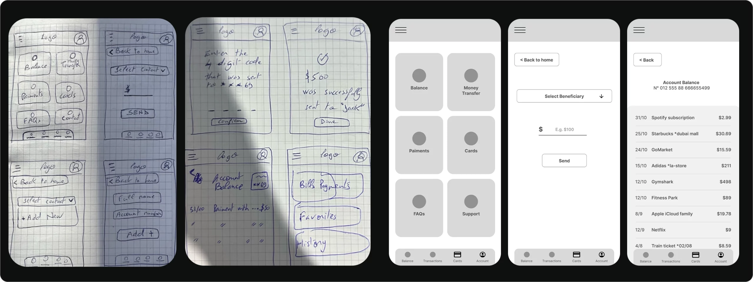 Paper wireframes and lo-fi prototypes to test screen structure and flow.