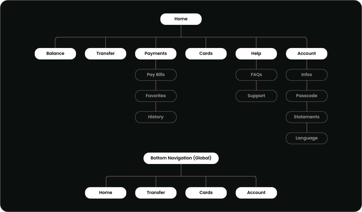 Developed a sitemap to organize features (Home, Balance, Transfer, Payments, Cards, Help, Account) for clear, logical navigation.